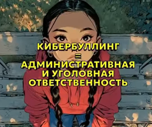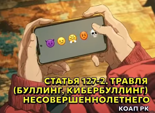 🚫 Кибербуллингке Қазақстан заңымен тыйым салынған! Бұл үшін келесі жауапкершілік қарастырылған: 🔹 ҚР ӘҚБтК 127-2-бабы — кәмелетке толмаған баланы қорлау (буллинг) (30 АЕК-ке дейін айыппұл); 🔹 ҚР ӘҚБтК 73-3-бабы — жала жабу; 🔹 ҚР ҚК 131-бабы — қорлау; 🔹 ҚР ҚК 105-бабы — өзін-өзі өлтіруге дейін жеткізу (9 жылға дейін); 🔹 ҚР ҚК 110-бабы — қинау (7 жылға дейін).
